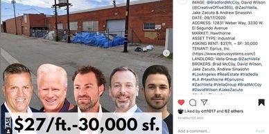 Lease to Epirus Systems for 30,000 SF in Hawthorne, CA for just below $2.25/SF/NNN ($27/Yr) asking rent with Vella Group.